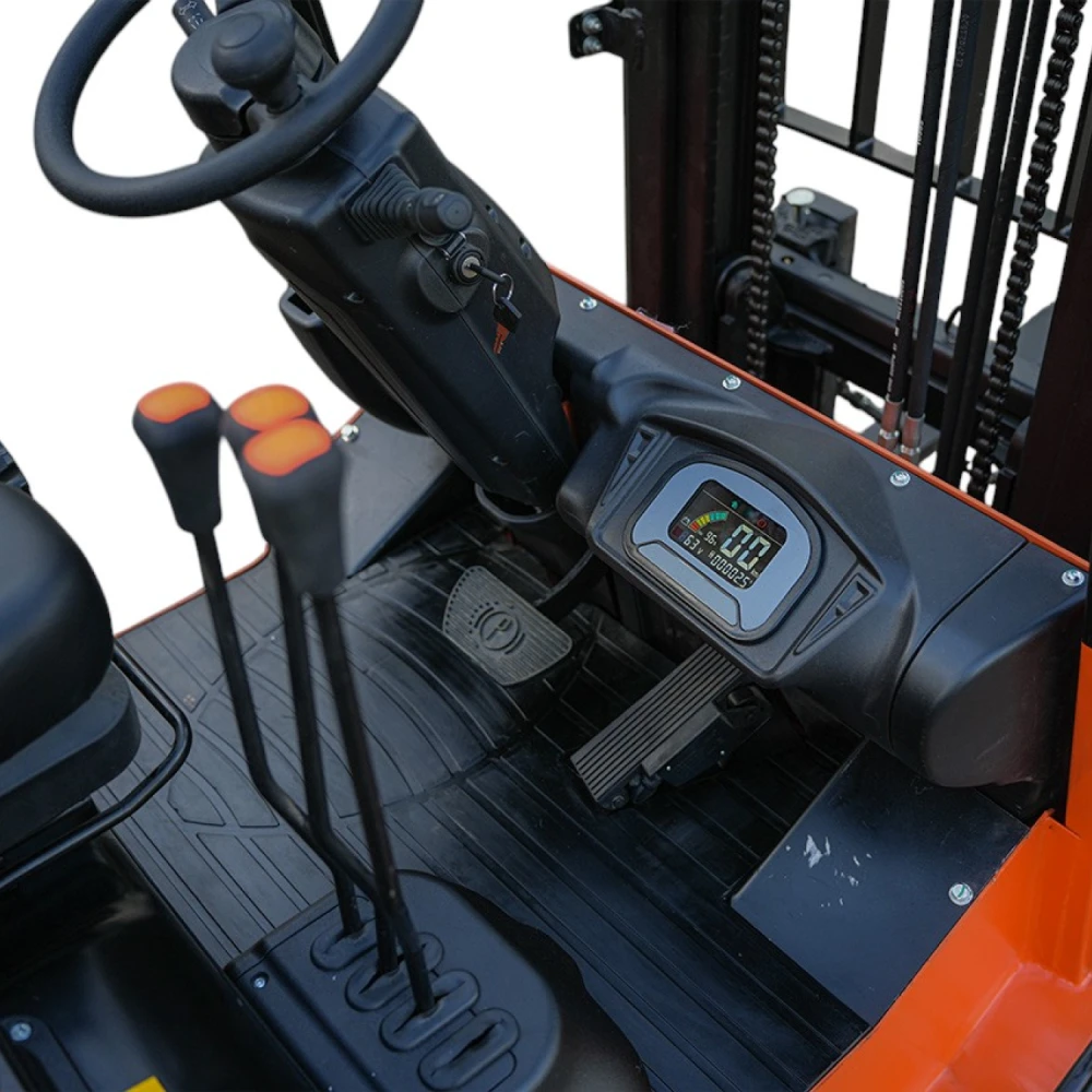 Грузоподъёмность 2000 кг позволяет легко справляться с тяжёлыми паллетами и крупными грузами, а высота подъёма до 3000 мм обеспечивает работу даже с высокими стеллажами. Электродвигатель мощностью 3900 Вт и свинцово-кислотный аккумулятор (60V/210Ah, весом 300 кг) гарантируют стабильную работу в течение смены без необходимости частой подзарядки.